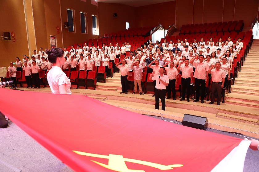 在雄壯的國歌聲中,大會拉開了帷幕。黨委副書記、紀(jì)委書記聶仕華帶領(lǐng)全體黨員重溫了入黨誓詞,以此牢記黨的宗旨,強化黨員意識。