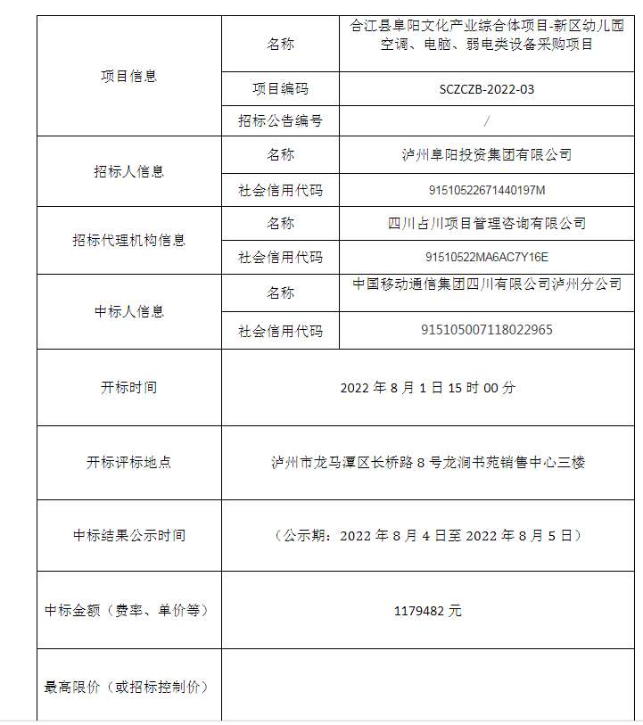 合江縣阜陽(yáng)文化產(chǎn)業(yè)綜合體項(xiàng)目-新區(qū)幼兒園空調(diào)、電腦、弱電類(lèi)設(shè)備采購(gòu)項(xiàng)目公開(kāi)招標(biāo)中標(biāo)結(jié)果公告