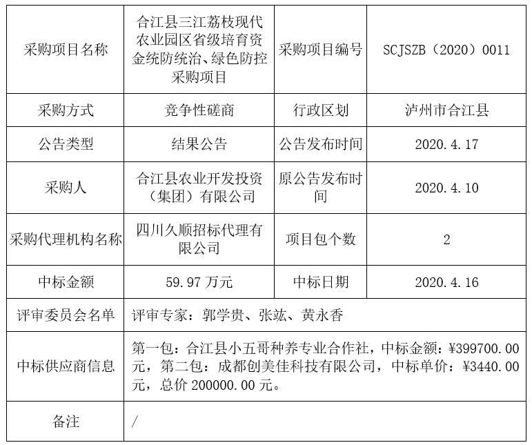 合江縣三江荔枝現(xiàn)代農(nóng)業(yè)園區(qū)省級(jí)培育資金統(tǒng)防統(tǒng)治、綠色防控采購項(xiàng)目競爭性磋商結(jié)果公告