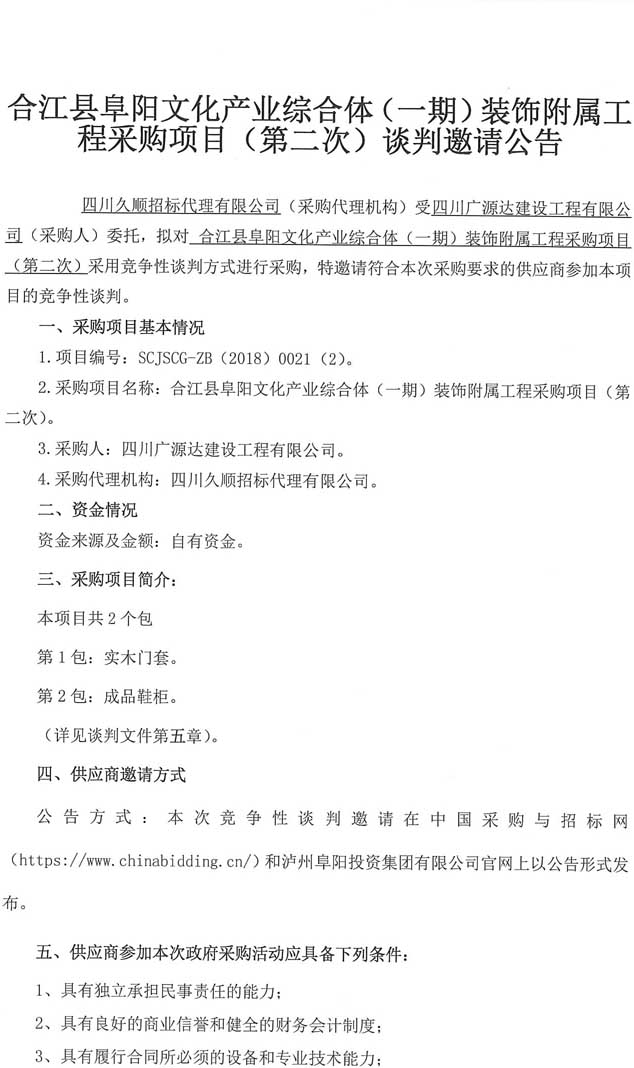 合江縣阜陽文化產(chǎn)業(yè)綜合體(一期)裝飾附屬工程采購項目(第二次)談判邀請公告.docx