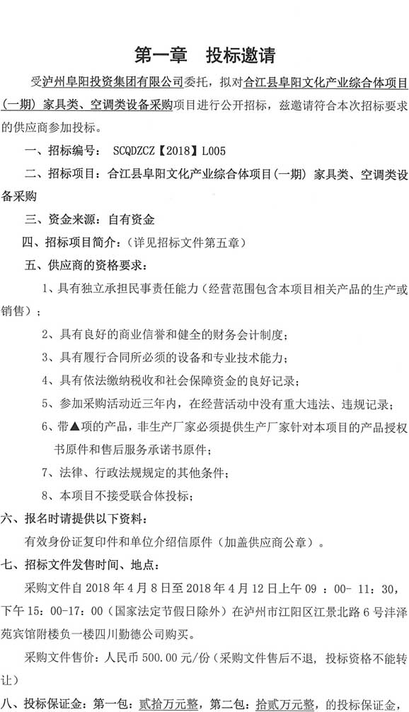 投標邀請:合江縣阜陽文化產業(yè)綜合體(一期)項目家具類、空調類設備采購