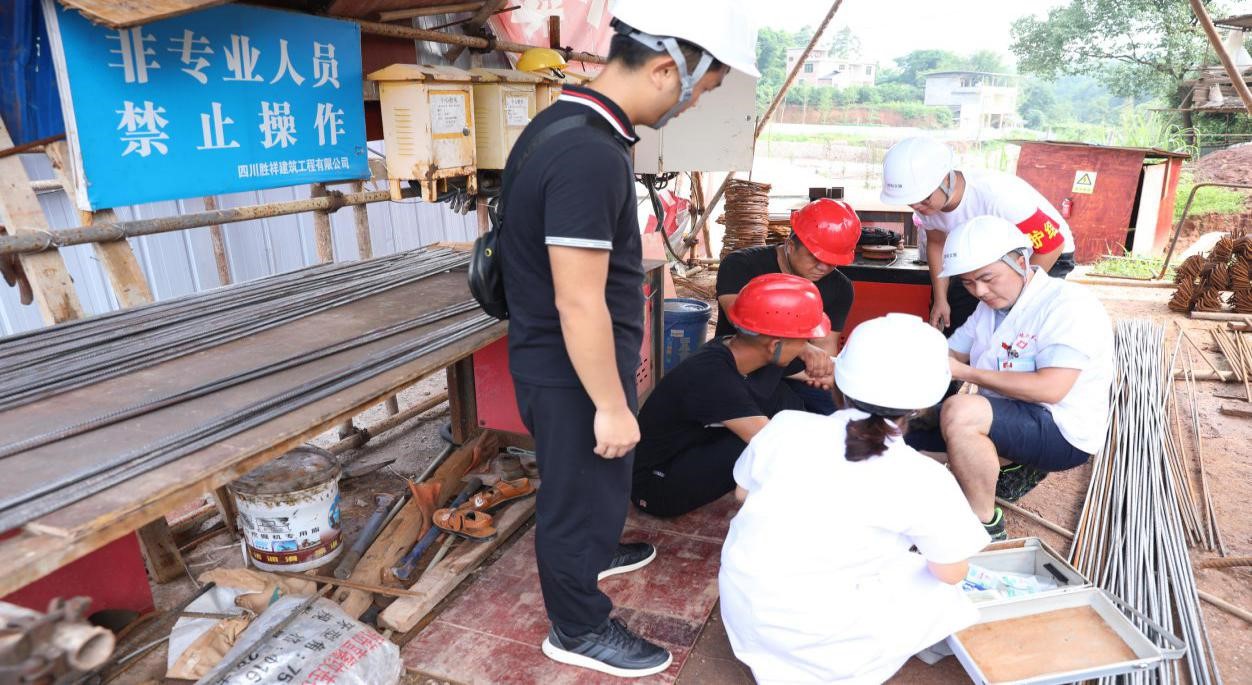 演練模擬龍掛山在建項目施工過程中一名鋼筋工人在鋼筋制作中手臂不慎擦劃傷,項目部立即進行緊急救援。演練總體設(shè)置三項課時,一是現(xiàn)場傷員救助,二是應(yīng)急救援的后勤保障,三是應(yīng)急救援知識的講解。