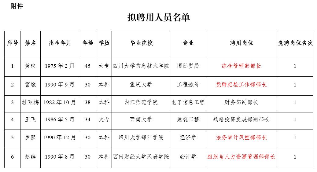 根據(jù)《瀘州阜陽(yáng)投資集團(tuán)有限公司關(guān)于2020年本部中層管理崗位內(nèi)部競(jìng)聘的公告》(瀘阜投〔2020〕20號(hào))規(guī)定,經(jīng)阜陽(yáng)集團(tuán)黨委研究決定,擬聘用黃映等6人為瀘州阜陽(yáng)投資集團(tuán)有限公司本部中層管理人員?,F(xiàn)面向社會(huì)公示7個(gè)工作日,公示時(shí)間2020年6月2日至2020年6月10日。公示期間,如有問(wèn)題,請(qǐng)及時(shí)向?yàn)o州阜陽(yáng)投資集團(tuán)有限公司組織與人力資源管理部反映。要求舉報(bào)者署實(shí)名,實(shí)事求是地反映問(wèn)題,并提供必要的調(diào)查線索。