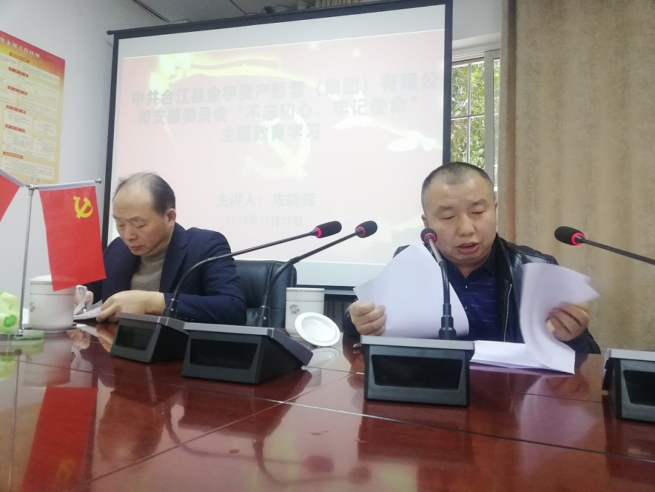 2019年11月27日合江縣金宇資產(chǎn)經(jīng)營(集團)有限公司組織“不忘初心、牢記使命”主題教育學(xué)習(xí),朱曉輝總經(jīng)理在會上要求員工時刻牢記“講政治、講忠誠”“守紀(jì)律、講規(guī)矩”,樹牢紅線意識;指出主題教育學(xué)習(xí)在時間安排上雖然接近尾聲,但是時刻不能松懈,要持續(xù)增強“四個意識”、堅定“四個自信”、做到“兩個維護(hù)”,為新時代發(fā)展站好崗、履好職。