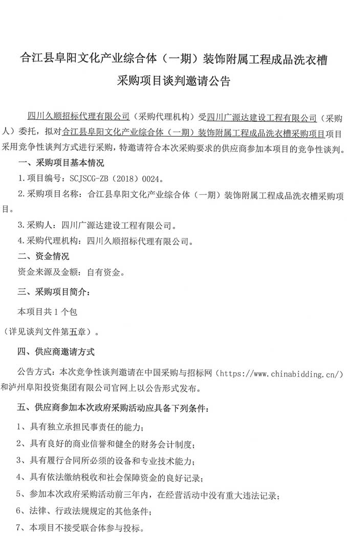 合江縣阜陽文化產(chǎn)業(yè)綜合體(一期)裝飾附屬工程成品洗衣槽 采購項目談判邀請公告.doc