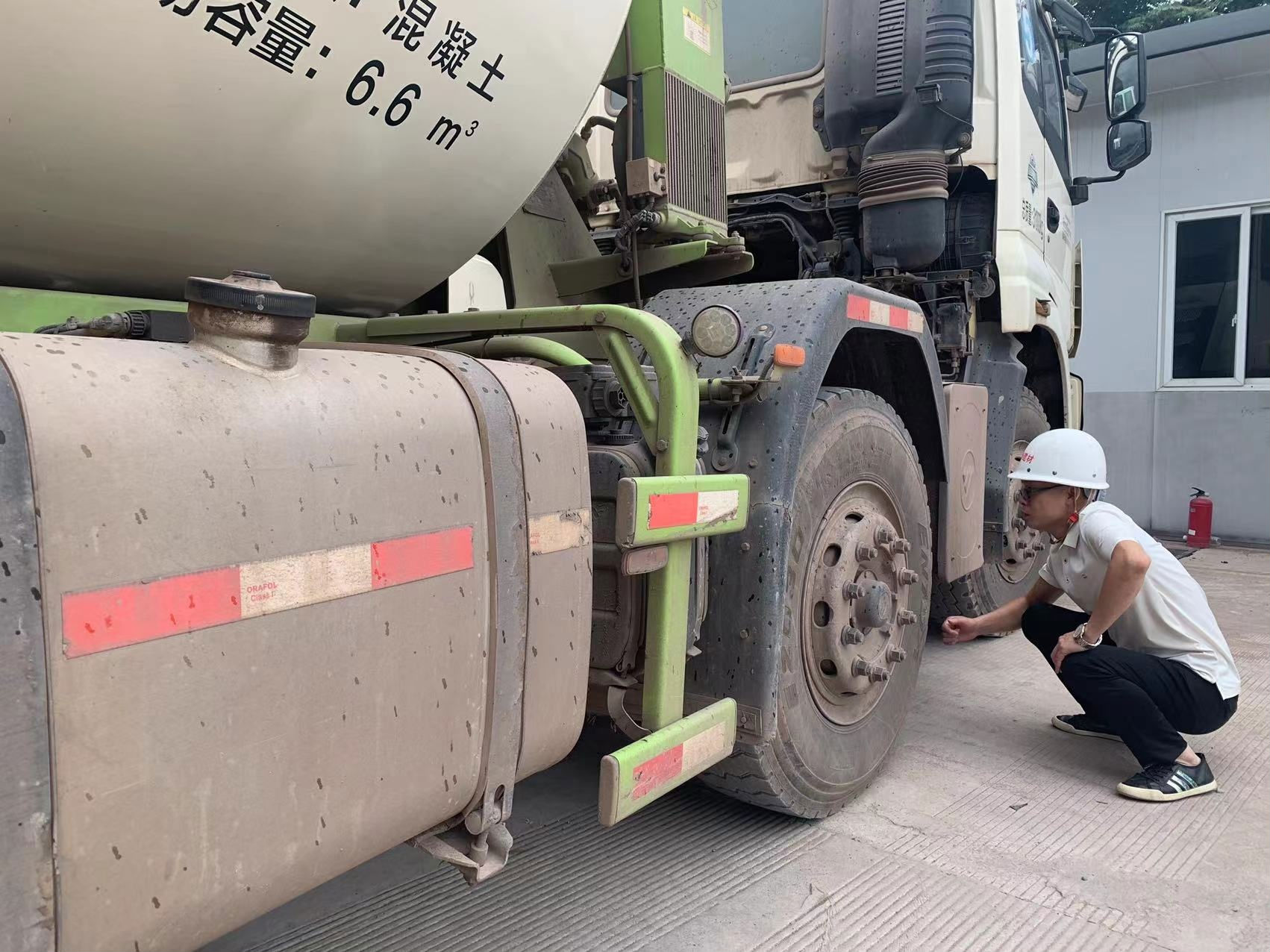 在國(guó)瑞商貿(mào)公司商砼站的停車場(chǎng)內(nèi), 總有一個(gè)身材清瘦、 架著一副眼鏡的人對(duì)即將開展運(yùn)輸任務(wù)的罐車進(jìn)行安全檢查, 并對(duì)司機(jī)開展駕駛前的安全教育, 他從擔(dān)任公司車隊(duì)長(zhǎng)兼生產(chǎn)調(diào)度以來, 始終堅(jiān)守著車輛出發(fā)前的檢查工作, 他就是國(guó)瑞黨支部委員王平。