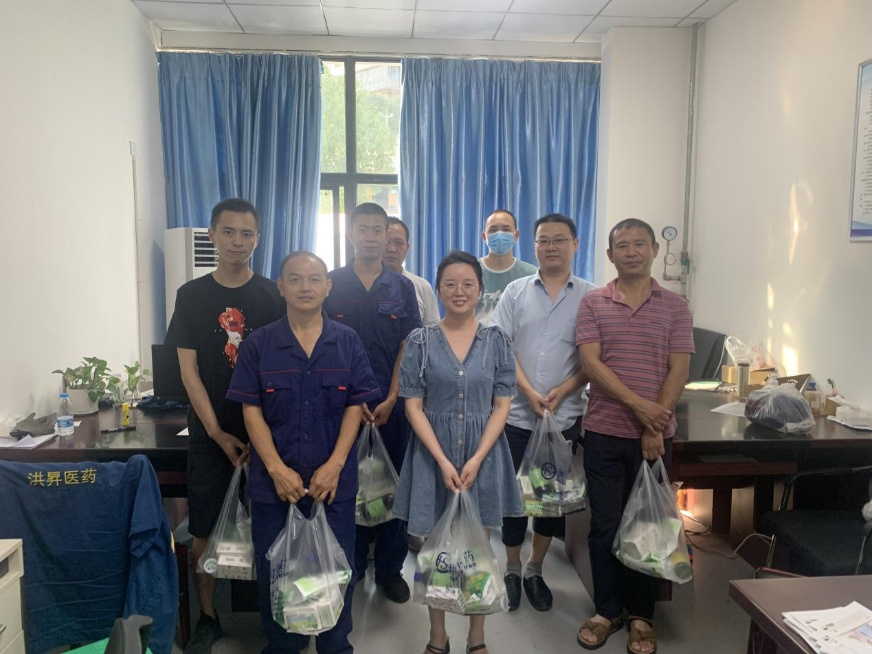 2022 年 7 月 8 日, 瀘州康力健醫(yī)療投資有限公司下屬公 司 四 川 洪 昇 醫(yī) 藥 有 限 公 司 組 織 開 展 “ 夏 日 送 清 涼 ” 活 動(dòng) , 工 會(huì) 主 席 周 容 帶 領(lǐng) 工 作 人 員 慰 問 奮 戰(zhàn) 在 高 溫 一 線 的 廣 大 干 部 職 工 , 為 他 們 送 去 了 藿 香 正 氣 液 、 風(fēng) 油 精 、 十 滴 水 、 夏 桑菊等防暑降溫物資。