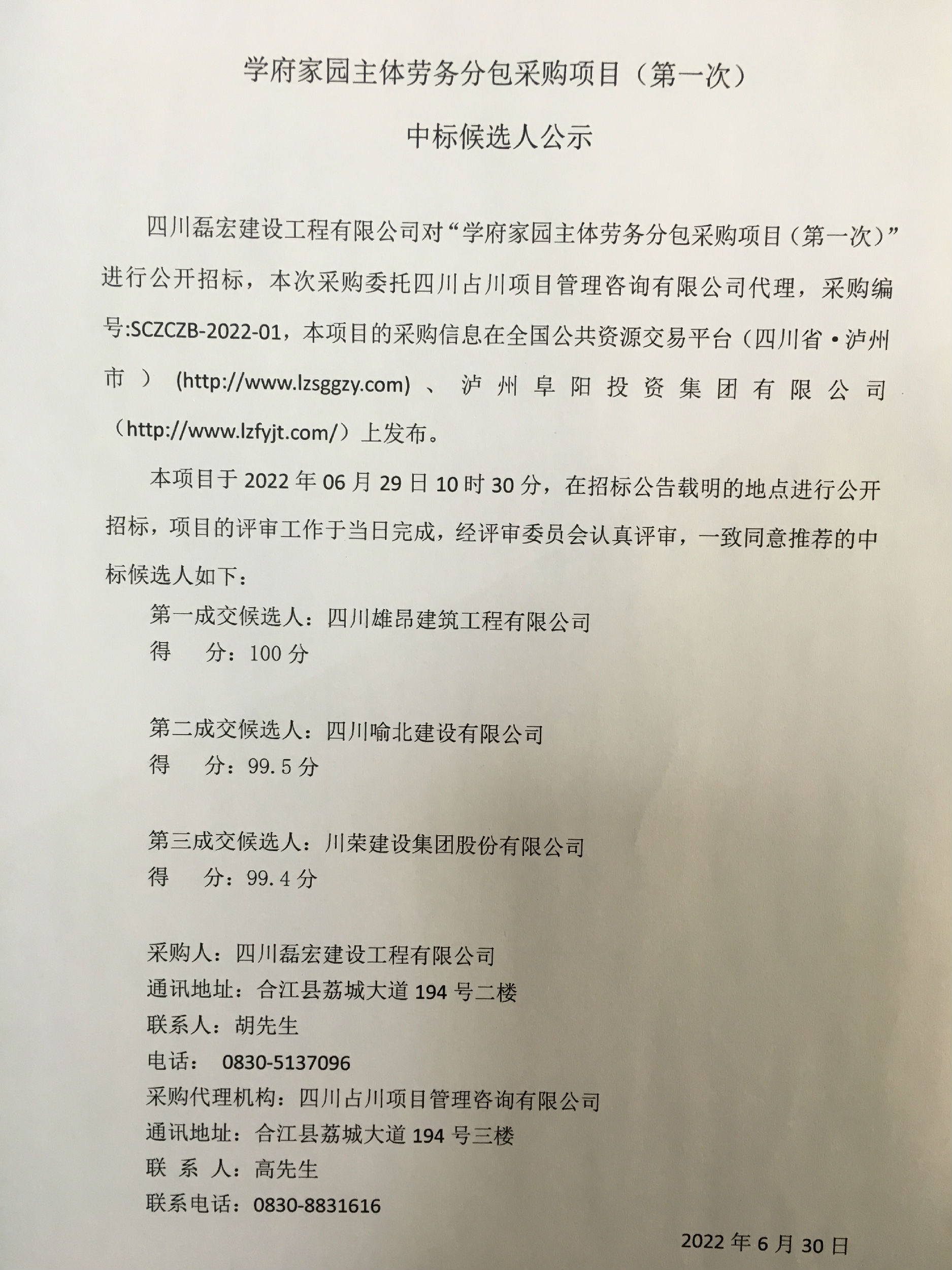學府家園主體勞務分包采購項目(第一次)中標候選人公示