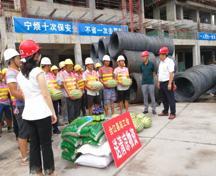 2019年8月5日下午,縣總工會會同城投公司、鑫晟公司、廣源達(dá)公司到鑫晟學(xué)府項(xiàng)目開展送“清涼”活動。縣工會領(lǐng)導(dǎo)一行對建筑工人表示慰問,并為他們送上藿香正氣液、風(fēng)油精、西瓜、綠豆、白糖等降暑防暑物品。