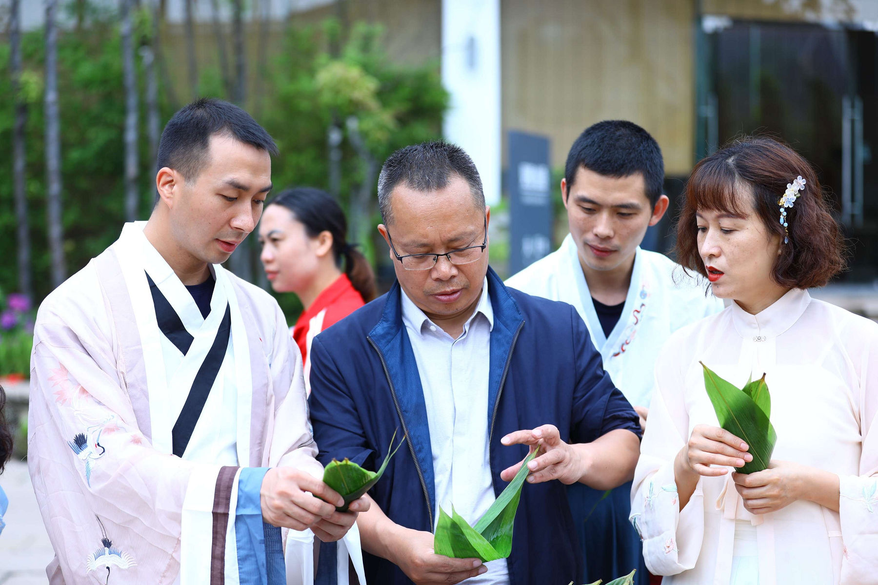龍掛山景區(qū)是阜陽集團(tuán)下屬符陽文旅公司打造的的文 化休閑度假旅游目的地, 景區(qū)云霧如海, 美景如畫, 建筑獨(dú) 具傳統(tǒng)川南民宿特色。 活動(dòng)中, 阜陽集團(tuán)員工身著漢服, 人 與自然情景交融、交相輝映,仿若穿越到了“狗吠深巷中、 雞鳴桑樹顛”的古代美好田園生活。在見禧 . 山語的院子里, 大家圍成一圈, 開展包粽子比賽。 員工們踴躍參加、 興致高 漲, 集團(tuán)總經(jīng)理任東財(cái)和員工們一起動(dòng)手, 互相學(xué)習(xí)、 邊學(xué) 邊包、 比拼手藝, 包出了三角形、 長(zhǎng)方形、 圓錐形等形態(tài)各 異的粽子,現(xiàn)場(chǎng)洋溢著歡樂的節(jié)日氣氛。